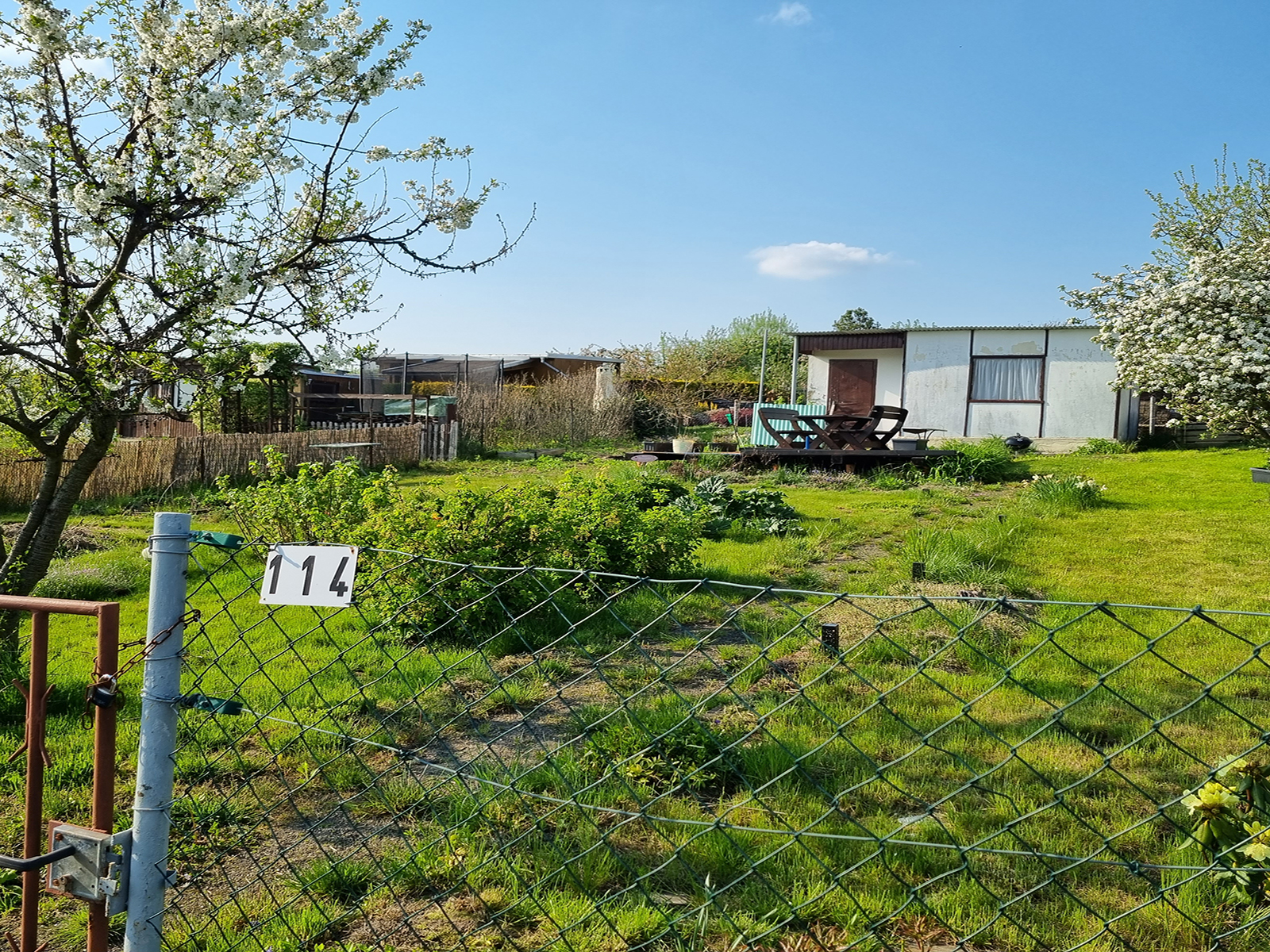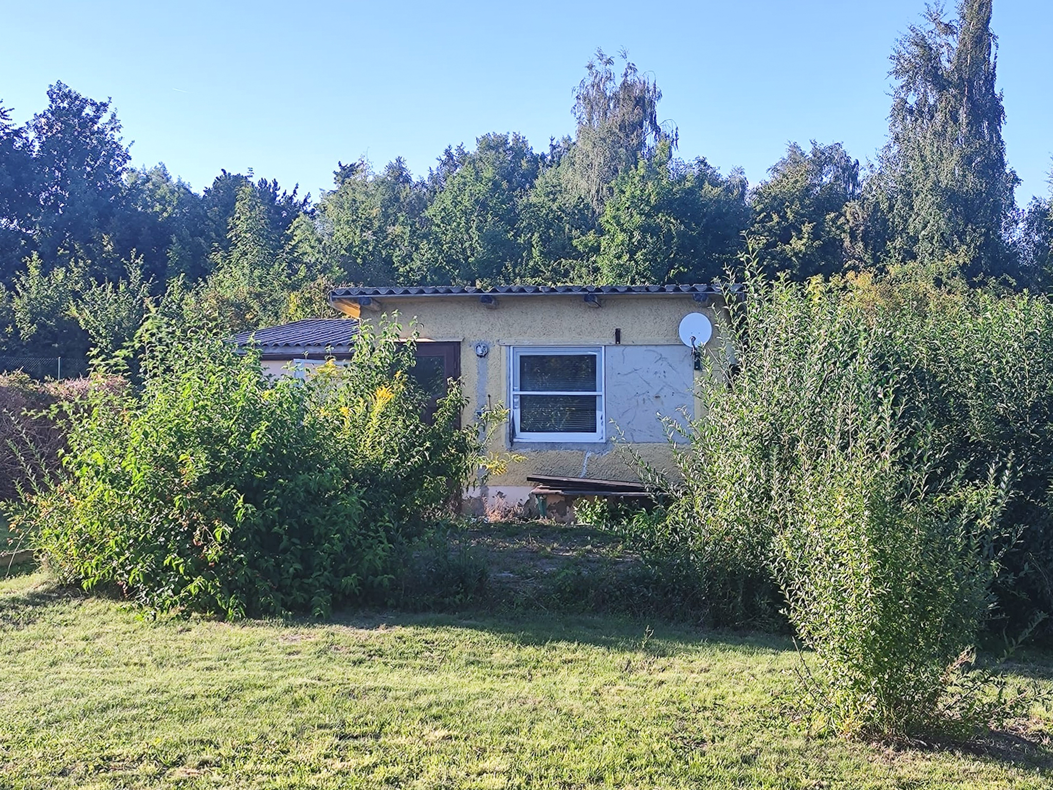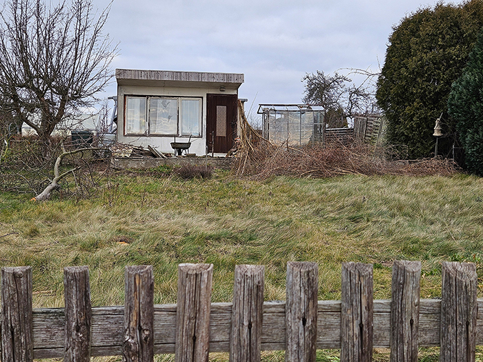 Dieser Garten mit einer Steinlaube möchte gern aus seinem Dornröschenschlaf erweckt werden. Die Parzelle ist 243 m² groß. Strom und Wasser können jederzeit wieder angeschlossen werden.